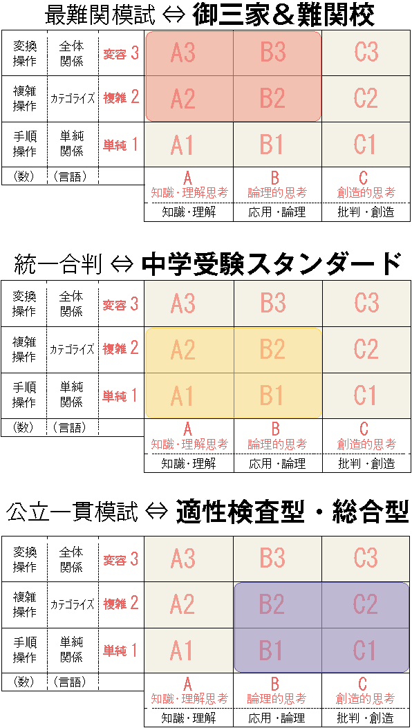 難関校ではA3やB3くらいまで出題される。御三家レベルになると学校によってはC2の領域にまで踏み込むこともあるという。中堅校レベルであればB2までに対応できていればいい。公立中高一貫校で求められる知識レベルは中堅校とほぼ変わらないが、情報の読取力や知識の活用力、表現力に加えて「あなたの考えを述べなさい」という問いに象徴されるように、Cの領域にまで踏み込むことが求められる。