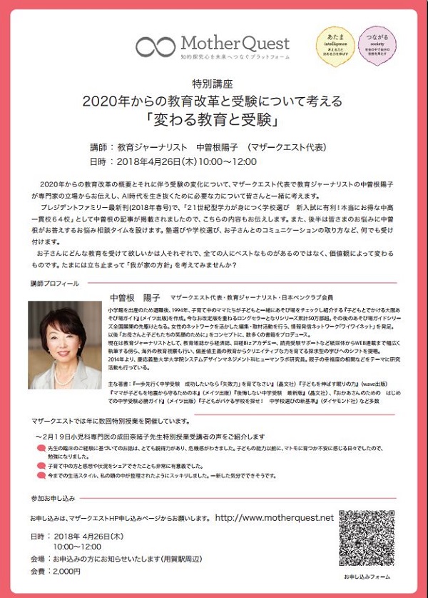 ※当コラム筆者の中曽根陽子さんによる4月26日(木)開催の教育セミナー(特別講座)「2020年からの教育改革と受験について考える『変わる教育と受験』」のご案内も掲載しています。