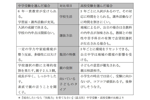 そこで、中学受験を選んだ場合と高校受験選んだ場合の違いを見てみましょう。表を拡大