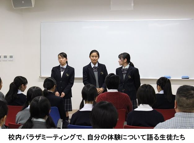 この7日間で彼女たちが得たものは何だったのでしょうか。堂々と自分の意見を述べる同世代の姿から刺激をうけたでしょうし、多様な価値観を持つ人とどうしたら分かり合えるのか葛藤もしたでしょう。単に英語がもっとできるようになりたいという表面的なものではなく、深く自分を見つめ直す機会になったはずです。だからこそ、帰国後はこの経験を伝えたいと、いてもたってもいられずに、英語祭でこの体験を英語でプレゼンテーションしたり、自主的に校内バラザミーティングを開催したり、この経験を全校に還元、浸透させる役割を果たしたそうです。現在、それぞれの夢の実現のために頑張っているという卒業生たち。きっと彼女たちにとっては、その後の人生に影響を与えるほどの濃い経験だったのでしょう。