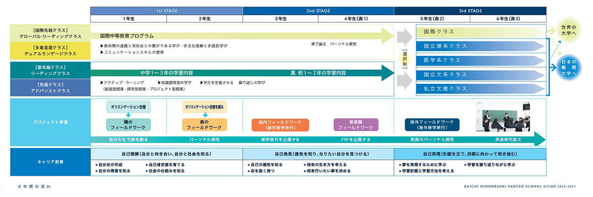 そうして学力の土台を作った上で、高2から、海外の大学への進学を目指す国際クラスと、国立理系、国立文系、医学部系、私大文・理系の各コースに分かれて大学受験に向けた本格的な学習に取り組みます。