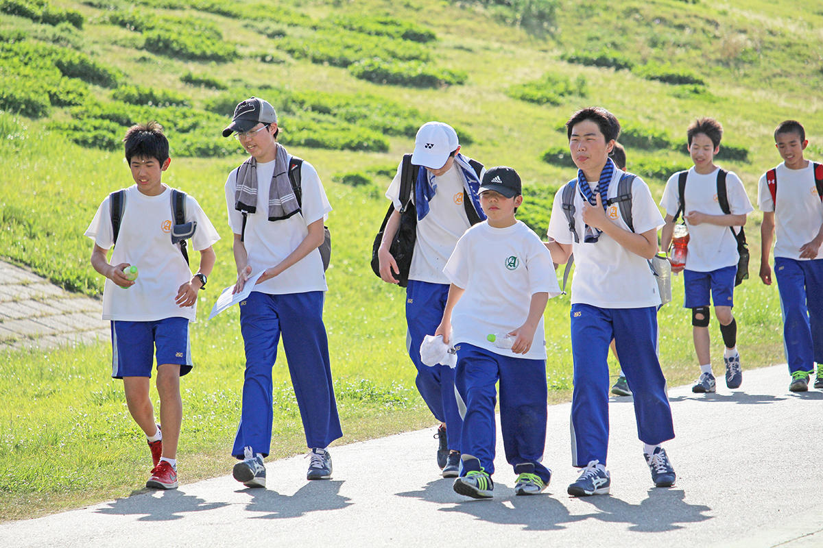 清掃と同様に縦割りで行なう名物行事が、毎年4月に行われる中学生の強歩大会です。学校から葛西臨海公園までの往復など30kmを歩ききるもので、慣れない中1にとっては楽しいだけの行事ではありません。「強歩大会は、中1が中2や中3と組んで、グループ単位で歩きます。上級生は自分が中1のとき、何が苦しかったか、どうすれば少しでも楽に歩けるかを思い出しながら中1にアドバイスし、声をかけて励ましながらゴールを目指します」(神嵜先生)。たくましさや忍耐力、体力を養うだけでなく、縦のつながりを構築し、お互いを思いやる心を育てる行事といえます。
