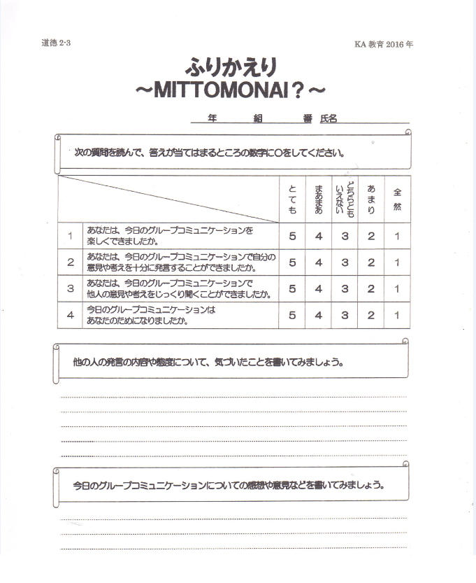 人の気持ちに配慮できるように、道徳教育にも力を入れています。道徳教育委員の先生がカリキュラムを組み、年間で20時間ほどの授業を行います。今は多忙で踏み込んだしつけに時間を割けない家庭も多いので、学校がその役割を担っているのです。道徳のテキストやエゴグラムの教材などの中から状況に合わせた題材を使って授業を行います。たとえば中3の道徳の授業のテーマは「恥ずかしいと思う心」「やりがいかお金か」「親への感謝の気持ち」「どちらを選ぶ? あなたの進路」など多岐にわたります。エゴグラム診断やグループコミュニケーションなどをとり入れ、家庭でできない深部までしっかりフォローして二人三脚で子どもの成長を応援してくれるのです。「心が育ってこないと学力は上がりません。学力を上げるためにも、心を育てることに力を入れています」(神嵜先生)。