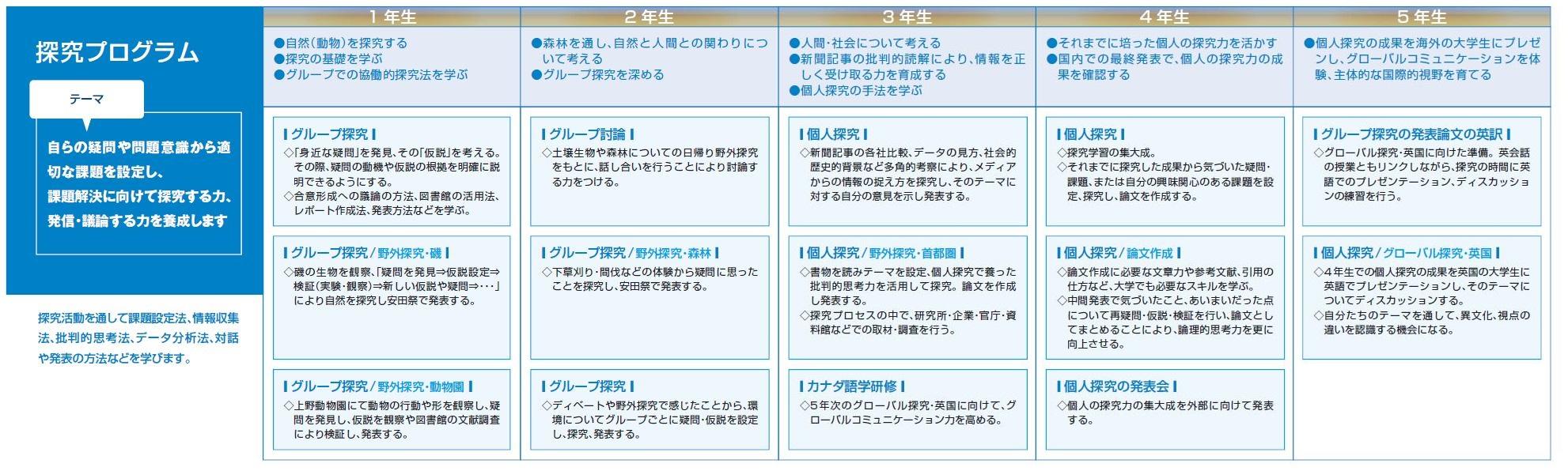 「1~2年生は週1時間の毎回の授業に加えて、夏休みの2泊3日の宿泊研修が加わります。3年生では宿泊研修はありませんが、先ほどのカナダの大使館で日帰りでの野外探究をするということがあります。そして4年生(高1)、5年生(高2)になると、これが週2時間の授業になります」(物部先生)