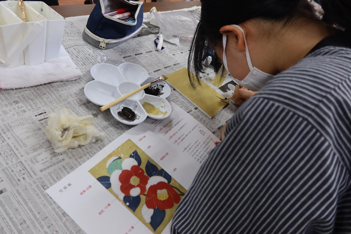 普段は日本画に馴染みがなく、最初は「難しそう」といイメージを持っていました。でもやり始めたら楽しかったです。なかでも一層・二層と、全体にベースとなる色を薄く塗る工程が特に楽しかったです。事前学習では、明治時代に西洋画が入ってきたことで、日本画の価値が改めて見出されたという歴史的背景を知りました。新しいものが入ってきたことで、今まであったものが見直されるという点が興味深かったです。