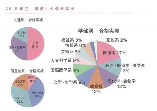 「ここ数年、現役での大学進学率は90%を超えています。国公立では東京農工大学や首都大学東京、東京学芸大学、防衛医科大学、私立では早稲田大学、慶応大学を始め、上智大学や東京理科大学、東京慈恵会医科大学、昭和大学、東京薬科大学、明治薬科大学、昭和薬科大学、津田塾大学、東京女子大学、G-MARCHなどにも合格者を輩出しています。」