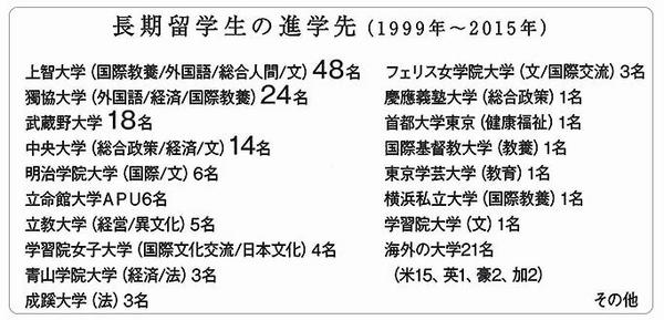 長期留学生の進学先は多様でその実績も目を見張るものがあります。「上智大学への指定校推薦の4枠やアメリカのモンタナ州立大学への推薦枠を設けるなど、幅広い進路に対応しています。長期留学で飛躍的に向上した語学力を活かして、TOEICやGTECなどのスコアを取得するなど『国際交流コース』の特徴を最大限に活用した進路指導に取り組んでいます。