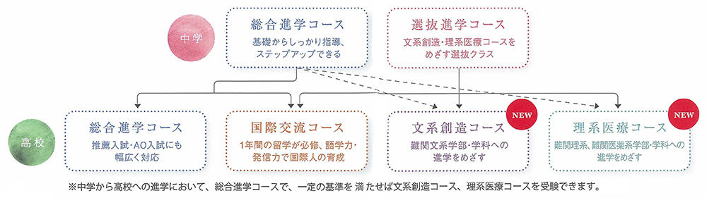 中学の『総合進学コース』は高校で『総合進学コース』と『国際交流コース』へ接続します。中1・2では基礎固め、中3からは応用力の育成を中心にカリキュラムを組んでいます。ネイティブ教員による英語や知力の土台となる国語といった主要科目を中心にクラブ活動にも取り組むなどバランスよく学習していくのが特徴です。」