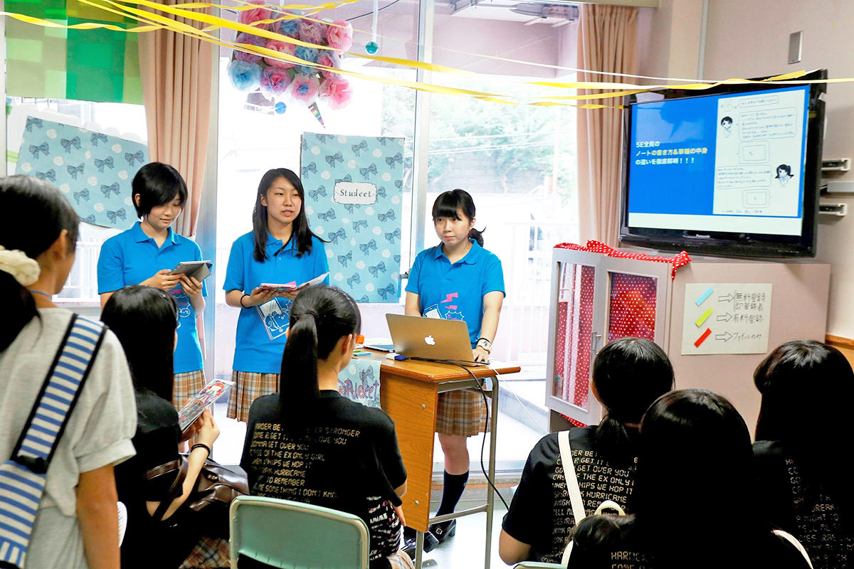 平川先生:これまで学習は個別に行うものでしたが、生徒たちがタブレットを持つようになり、新しい形で教え合う環境が生まれています。生徒と教員がweb上で共有するワークシートを使って勉強する生徒もいます。ノートの貸し借りも形態が変わりました。ノートを写真に撮り、共有して、わからなければわかる子に教えてもらう「教え合い」も生まれ、知識やアイデアは自分のものだけにするのではなく、シェアしあうという意識も育っています。