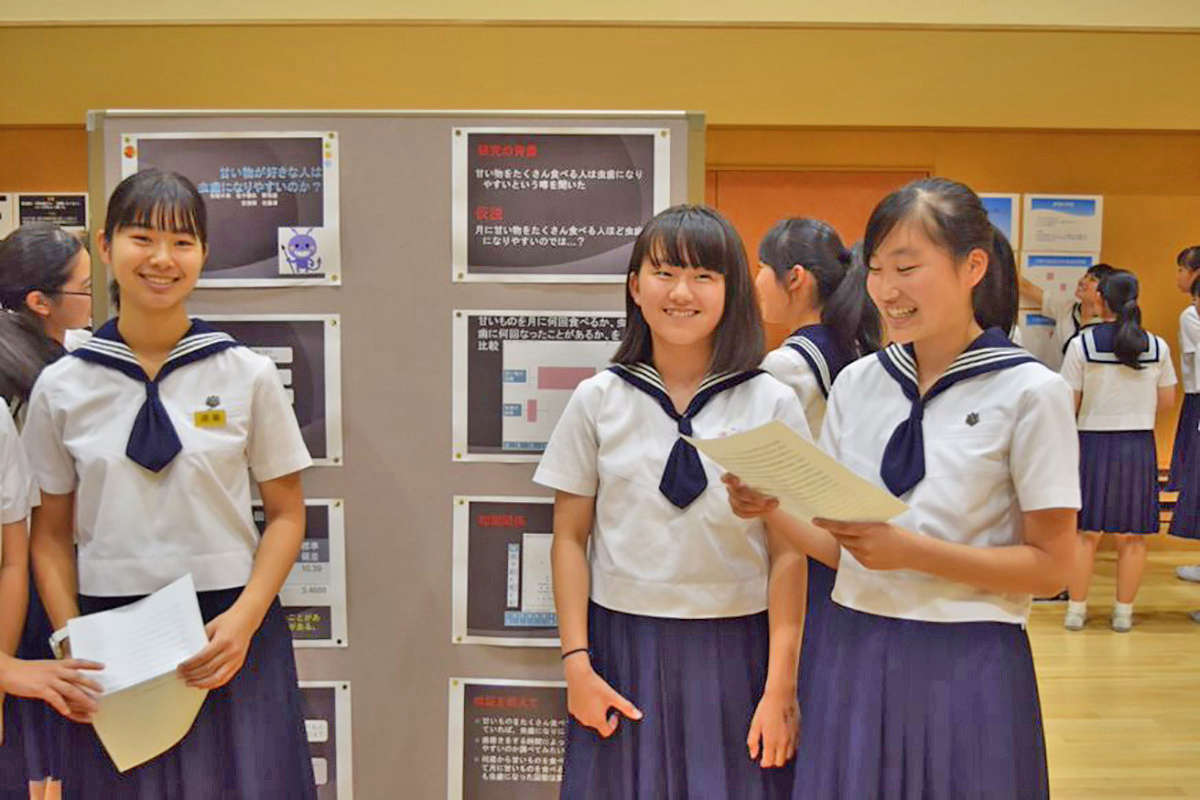 「成果の一例としては、とくに、中学からの入学生に、『社会の中で役に立ちたい』という意識が高く、医療系に進みたいという生徒が増えたことですね」と、高校教頭の横尾康治先生。現に、理数教育の充実で理系学部への進学率は21.9%(2017度)と「理系女子(リケジョ)」率も高く、国公立大学への進学者も増えています。