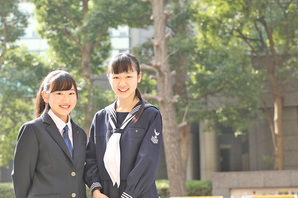 高校創設70周年を記念して、高校の制服がリニューアルしました。デザインしたのは、同校の一期生で同窓会会長でもあるブライダルファッションデザイナーの桂由美さん。共立生らしい知的な雰囲気にしたいと、色はネイビーブルーに。白く見えるブラウスは、じつは上品な淡いピンク。スカートのひだ、衿やポケットの縁にまで工夫を凝らした、立体感のある美しいシルエットになっています。ブレザーのボタンに採用した鳩のエンブレムは中学の「鳩の袖章」をモチーフに「輝き翔ばたく女性」をイメージし、ネクタイ柄のラインが交差している部分のラメは生徒たちの心の輝きを表したものだとか。「夏服はオプションでチェックのスカートがあるのでコーディネイトもできるし、とってもオシャレで素敵です」と、生徒にも大好評です。