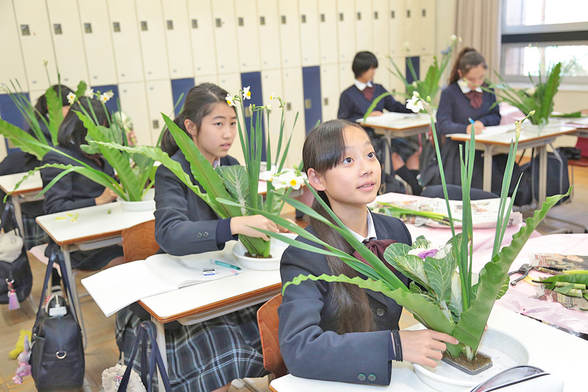 中学では礼法(茶道・華道)の授業を行います。茶室に上がる時に最初に教えるのが靴の置き方です。美しい箸の持ち方、置き方、懐紙の使い方、袱紗のさばき方...、そうした所作は覚えることは、たいへん有意義なことです。現在は秘書をしているある卒業生は「学校で学んだ華道の知識が仕事で役に立った」と話していました。卒業生が同窓会で集まると、必ず話題に出るのが伝統のペン習字や運針です。美しい文字は一生の宝物。卒業生が結婚やお子さんが生まれたなどの祝時に手書きの手紙をくれるのも、きれいな文字を書けるからだと思います。