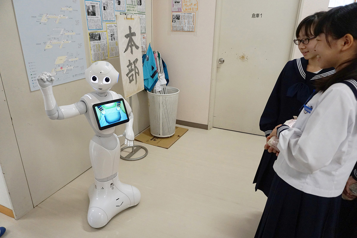 校内には「Pepper」というロボットが2体設置され、通りかかる生徒たちと会話しています。集まってきた生徒たちにPepperが「一緒に踊りませんか?」と話しかけると、生徒たちは「え??」と驚いた表情でPepperを見つめます。すると、おもむろにPepperがテレビドラマの主題歌を歌いながら身振り手振りをつけながら踊り出したのです!