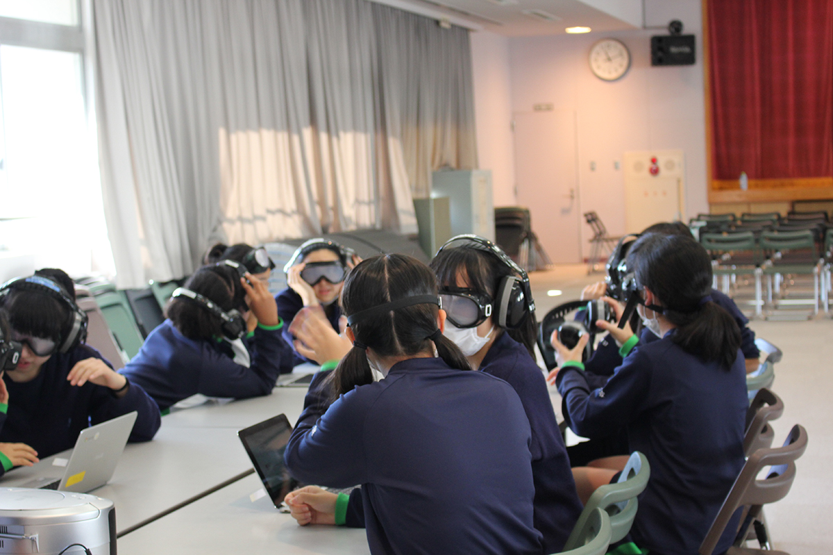 また、音が聞こえにくくなるヘッドフォンや、視界が白濁したり視野が狭くなるなど見えづらさを体験するアイマスクもつけてみます。「パソコンの文字がよく見えない」「小さい音が聞こえないから、孫と電話したくても話せないかも」と生徒たち。高齢者の辛さ、介助の大切さを身をもって感じられる貴重な体験をすることができました。