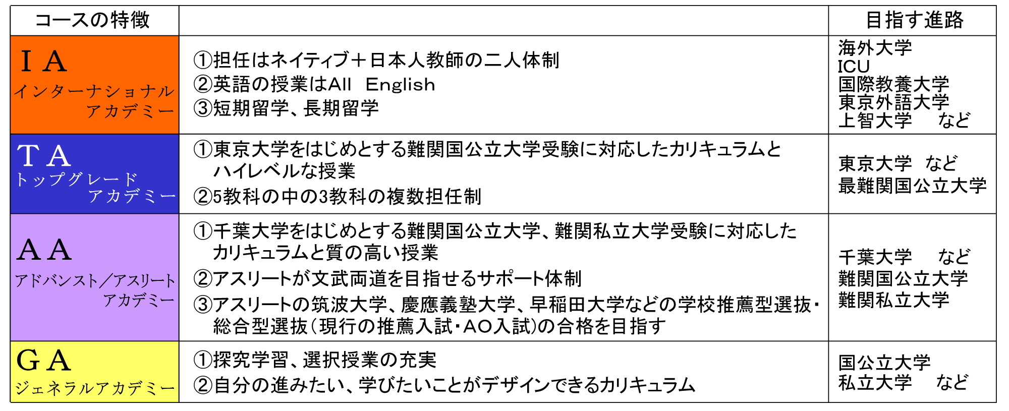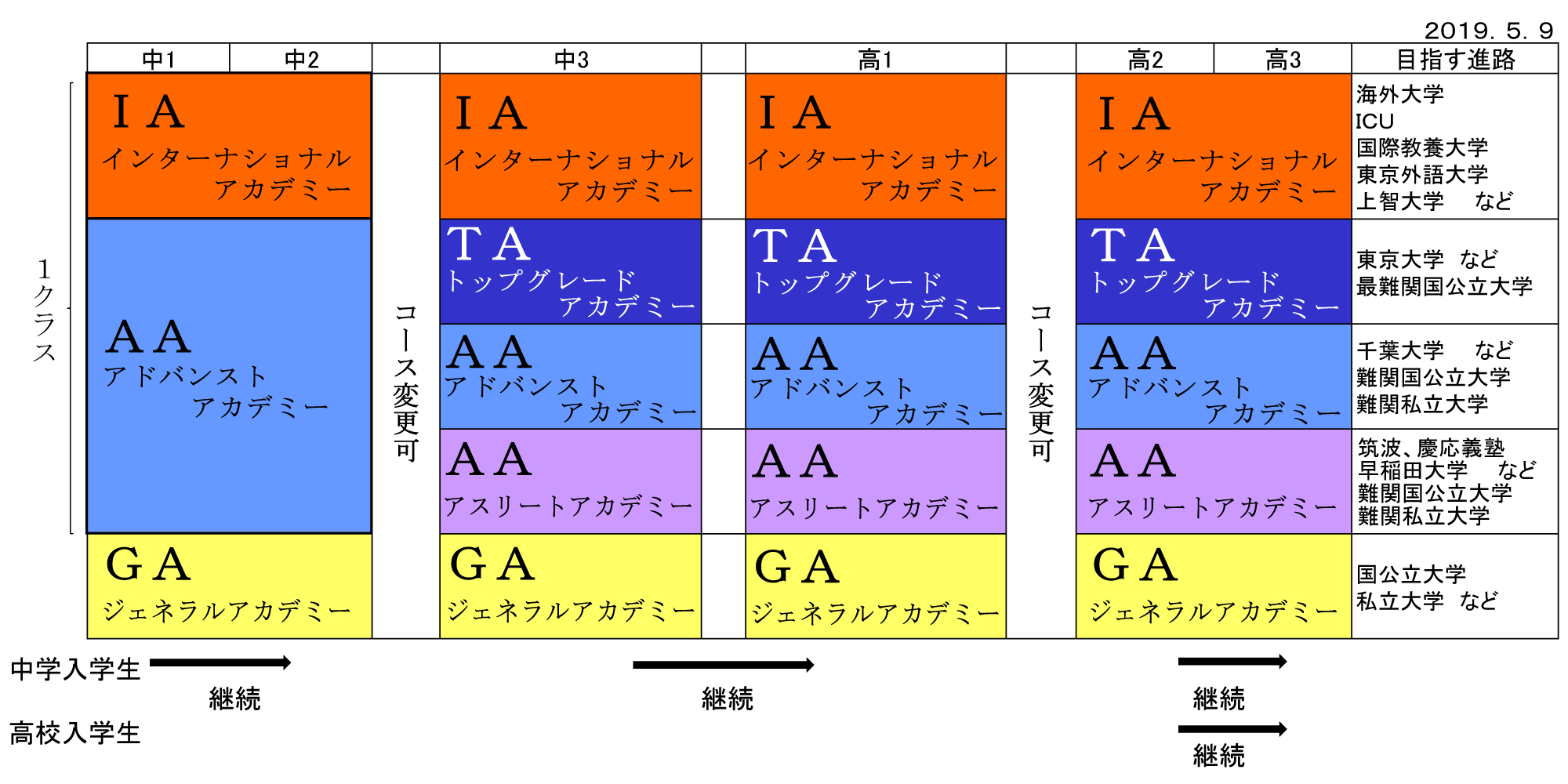 来年入学する新中1と、高校から入る外部生も加わる新高1で、この新コース制がスタートします。中1・中2はIA(International Academyインターナショナルアカデミー)コース、AA(Advanced Academyアドバンストアカデミー)コース、GA(General Academyジェネラルアカデミー)コースの3つの編成になります。
