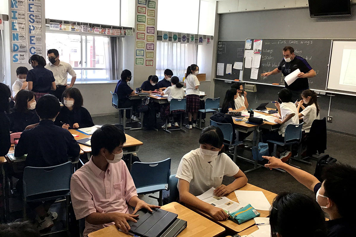 今年度は新型コロナウイルスの影響で、最初の1か月はオンライン授業を行っていましたが、今年から全生徒にiPadが配布されたので、オンライン授業もスムーズに行われました。「最初はうまくつながらなかったり戸惑いがありましたが、学年や教科ごとに教員が"こんな使い方もできるね"と情報交換して、どんどん使い方の幅が広がりました」(大野先生)。