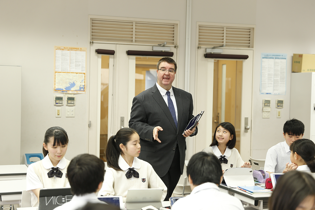 Native English Teacher(NET:ネイティブ英語教員)が副担任となり、副担任が担当する日はホームルームも朝礼での連絡も学級日誌もすべて英語を使用。日常的に英語を使う環境を作り、リスニングやスピーキングの能力を伸ばします。