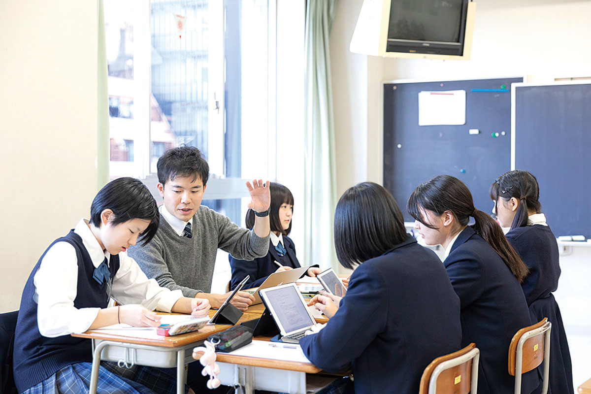 一人1台パソコンを所持し、インタラクティブなアクティブラーニングを実施。主体的に考え、協働力を養うPBL型授業を全教科で行っています。プレゼンテーションの機会が豊富で、そのための設備も整備。考えて書く、まさに思考力と表現力を身につけさせる取り組みで、大学入試のみならず、社会に出てから活躍するための基礎力を培うもの。小論文対策も月に一度、全校で実施しています。