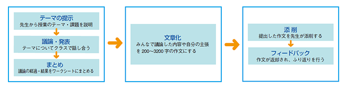 言語技術の授業は1年生から4年生まで、週に1時間。すべての授業は先生がファシリテーターとなり、生徒のディスカッションで進みますが、最終的に自分の主張を作文に書くことで締めくくります。ルールに則りながら問答を行い、相手の考えを理解したうえで、自分の意見を発信する力を鍛えていくのです。