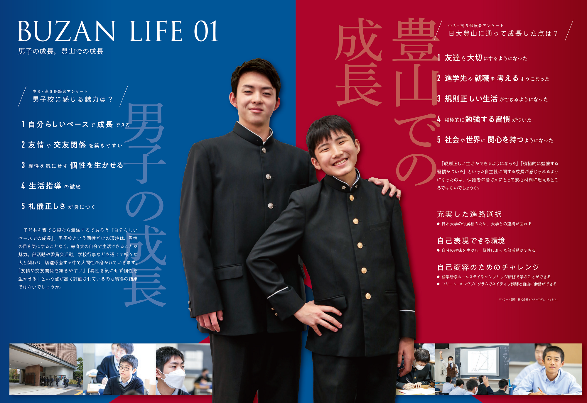 日本一の規模と多様な学部・学科を持つ総合学園・日本大学の直属付属校として、また首都圏の日大付属校では唯一の男子校として、この日大豊山中高には、私立中高のなかでも、いまでは希少な存在としての魅力があります。