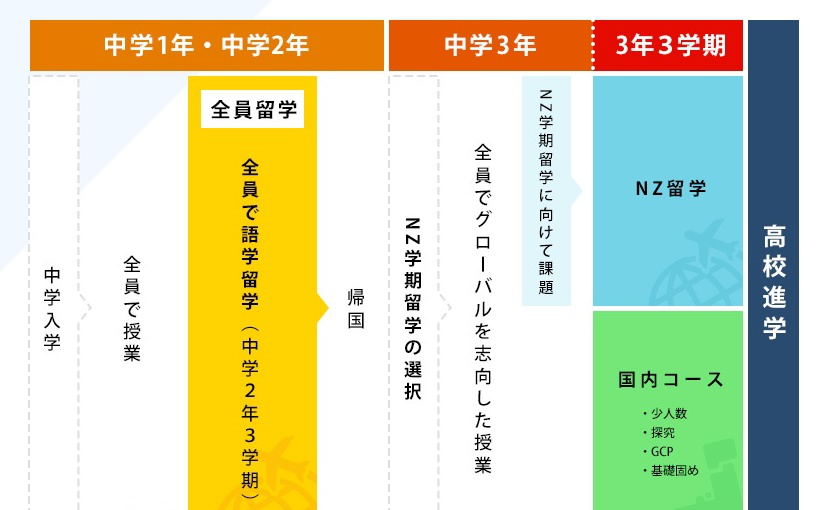 そして中3の1学期中にNZ学期留学または国内グローバル型プログラムのいずれかを選択した上で学びを進めます。