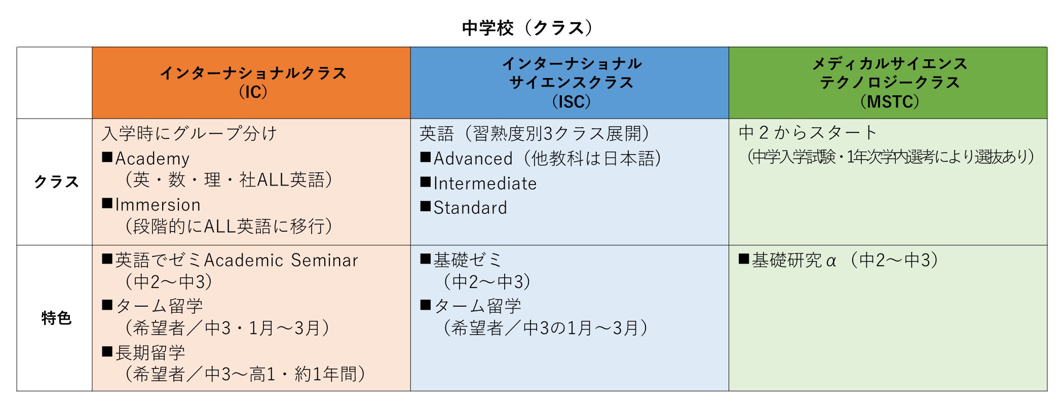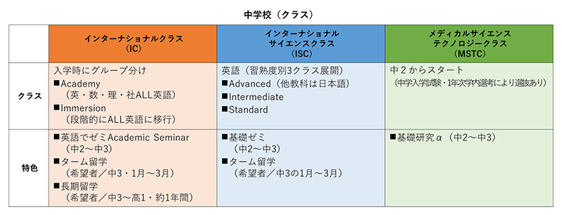 三田国際学園では現在、「国際生入試」「4科目入試」「英語入試」「算数入試」「MST入試」を実施しています。多様な価値観が学校生活、活動、研究を通して影響し合う環境づくりを意図しており、次年度からは従来よりもクラスの選択肢の幅が広がります。例えば、国際生は2022年度以降はインターナショナルサイエンスクラスを経てMSTC(学内選考あり)に入ることが可能になります。