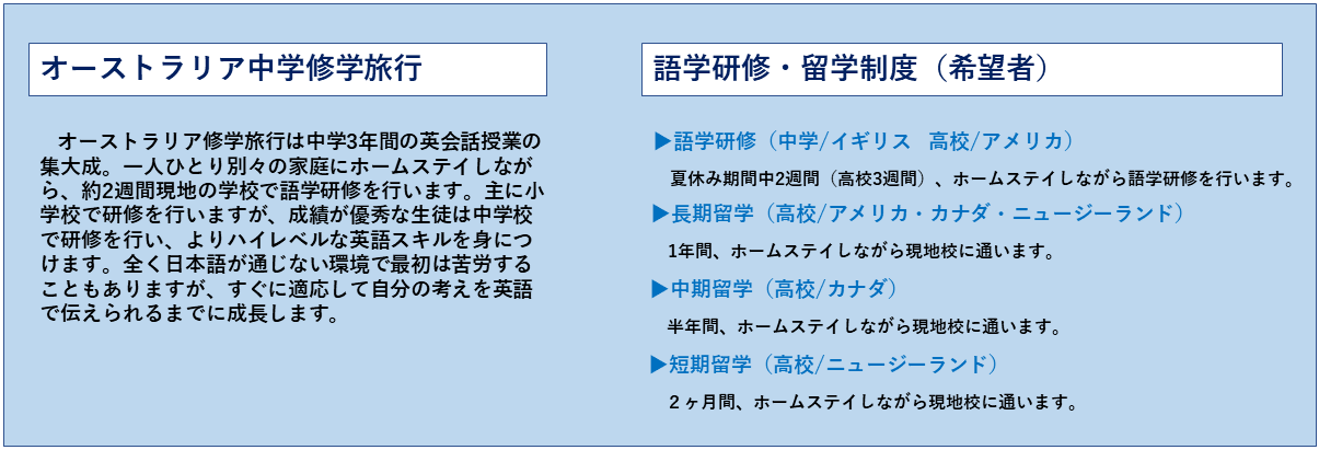 多摩大学目黒の学びの舞台は国内にはとどまりません。6年間で最大5ヶ国を訪問し、英語圏でも異なる文化を体験することができます。希望すれば中1からイギリスに2週間の語学研修に行くことができ、中3のオーストラリア修学旅行では一人ひとり別の家庭にホームステイしながら、約2週間現地の学校で語学研修を行います。経験豊富な2名のネイティブ教員による3年間の英会話授業の集大成として、日本語が一切通用しない中で過ごす2週間。最初は苦労することもありますが、すぐに適応して自分の考えを英語で伝えられるまでに成長します。