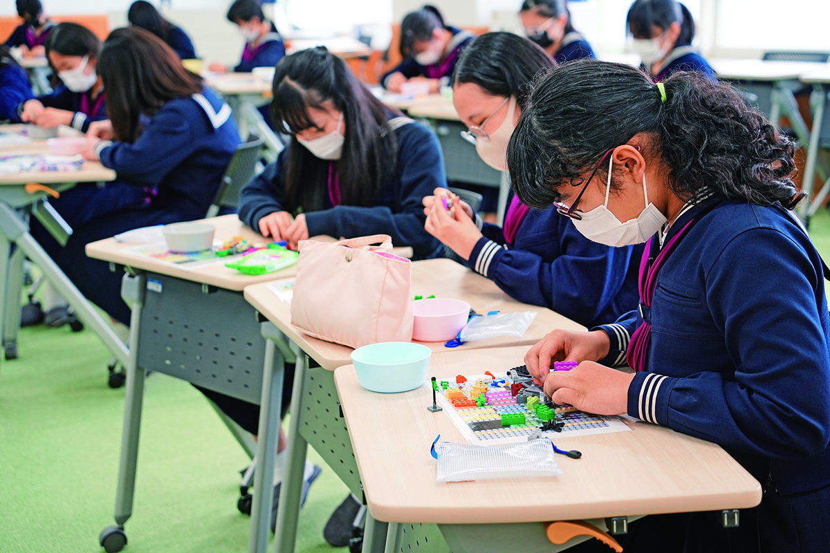 中井先生:「お互いの違いを楽しみ、作品を通して語るというメタファー表現に親しんだあとは、『わたしの考えるよりよい世界』というテーマで作品を作ってもらいました。総合学習の時間だけではなく、さまざまな教科を通しても、生徒たちは『世界の現状』について学びを深めつつあります。個々人が『これをなんとかしたい』というテーマに対して、自分なりの理想の世界をイメージすることを狙いとしていました。ブロックで作品を作ることで、言葉だけで言い表すよりも奥行きや具体性のある思考につなげられればとの思いからです。今後もタイミングを見ながら、手を動かしてブロックを触り、お互いの考えやイメージを共有する取り組みを続けていきたいと思います」
