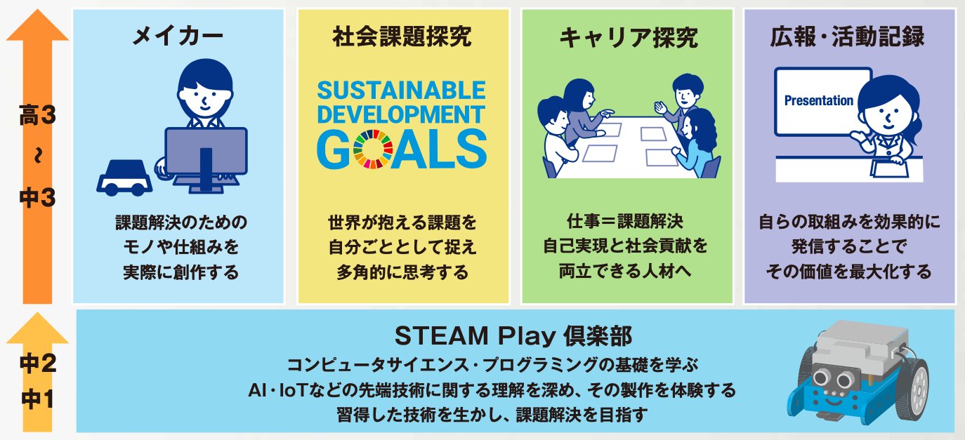 メイカー部門の中には「STEAM Play 倶楽部」というクラブ活動があり、週に数回のプログラミングロボティクス講座を行っています。50人ほどが週1回活動し、専任講師の指導も受けながら各自が興味のある課題に取り組むという内容。プログラミングを1から学んでプログラムを組み、レーザーカッターなどを使用して作ったロボットを動かせるようになります。