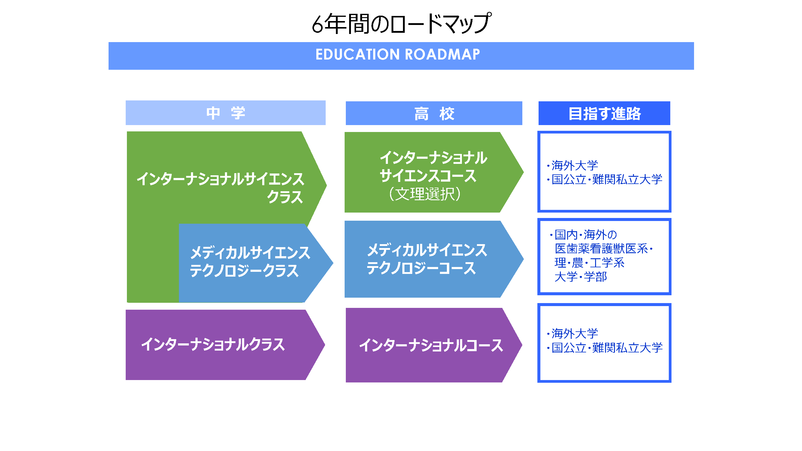 2022年度に始動した第2ステージの狙いは、三田国際学園が7年間かけて醸成してきた「SCIENCE」(科学的アプローチを学べる環境)と「INTERNATIONAL」(ダイバーシティの中で学べる環境)を最大限に活かすことにあります。全校に浸透させるために、今年度の中1より、多様な学びが特色の「インターナショナルサイエンスクラス」(ISC)と、圧倒的な英語環境が魅力の「インターナショナルクラス」(IC)の2クラス編成とし、全クラスに国際生を配属しています。中2からは理数教育に特化した「メディカルサイエンステクノロジークラス」(MSTC)がスタートし、3クラス編成となります。高校ではこの3クラスがそれぞれのコースへと移行します。