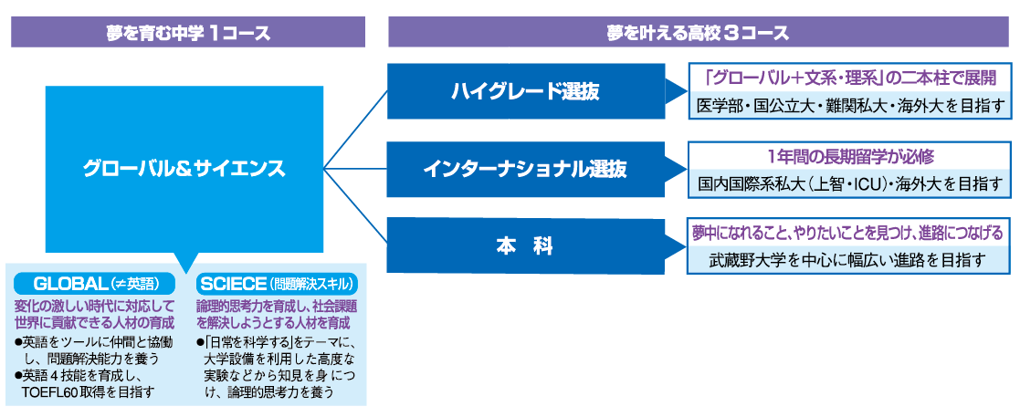 2019年の中学入学生からは、これまでのコースを統合し、「グローバル&サイエンス」の1コースとなります。