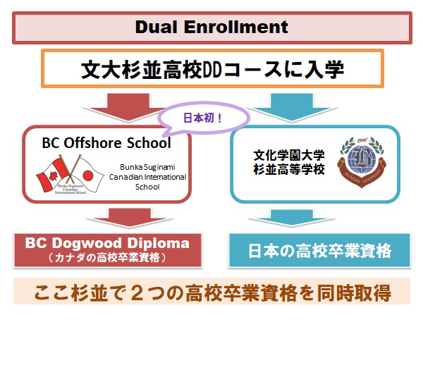 日本にいながら海外現地校のカリキュラムを学べるプログラム「ダブルディプロマ」が注目を集め、日本でも導入する学校が増えています。日本で初めてカナダのブリティッシュコロンビア州と連携して、高校ダブルディプロマ(DD)コースをスタートしたのが文化学園大学杉並(以下、文杉)です。DDコースではブリティッシュコロンビア州の公立高校と提携し、カナダの教員免許を持つ先生が来日して現地と同じ授業を行います。DDコースの生徒は文杉と同時にBunka Suginami Canadian International Schoolに在籍することになり、文杉卒業と同時に、カナダ・ブリティッシュコロンビア州の高校卒業資格も取得できるのです。