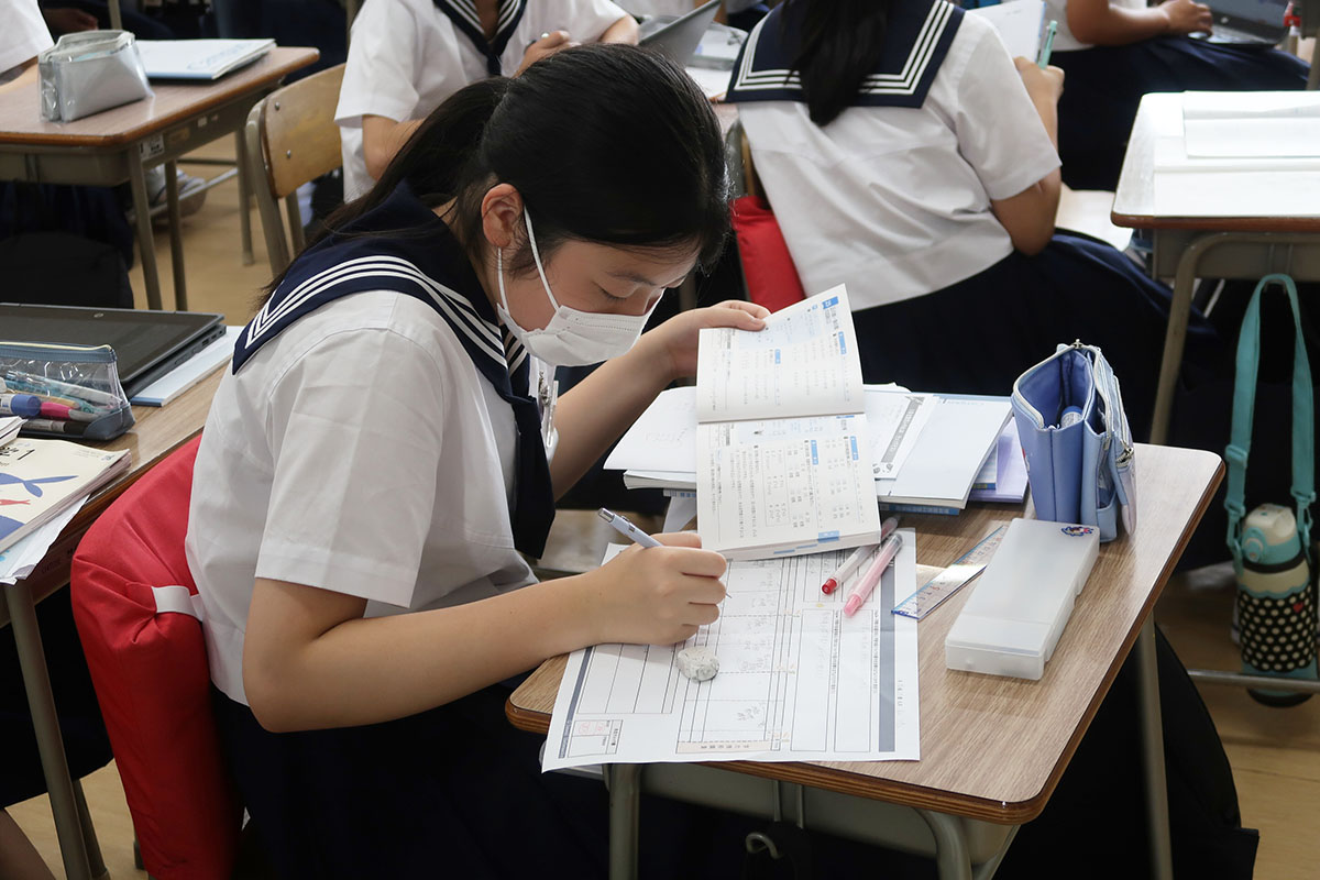 実際の授業では、どのように学習を進めているのでしょうか。夏休み前の中1・数学の授業を取材しました。同授業では、数学科の教員と面談を行い、生徒が考えた夏休みの学習プランの改善点などを話し合いました。