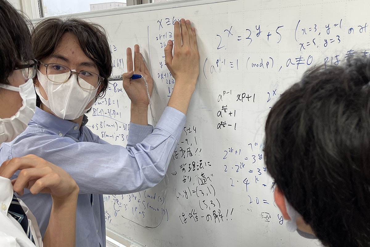 「数学同好会に今年、中1が8人入部してきました。コースは関係なく活動している様子を見ると数学好きな生徒が増えている印象を受けています。6月に開催された数検では中1で3級(難度は中3程度)合格者が 3〜4人いました。活動風景を覗いたら『チャート式』を見ているなど楽しそうですね。もっと歯応えのある問題にチャレンジしたら?なんて話もしますが、彼らの活躍が理系の盛り上がりにつながればいいなと思っています」と、数学科の教諭でもあり、同会の顧問でもある井田先生は破顔します。