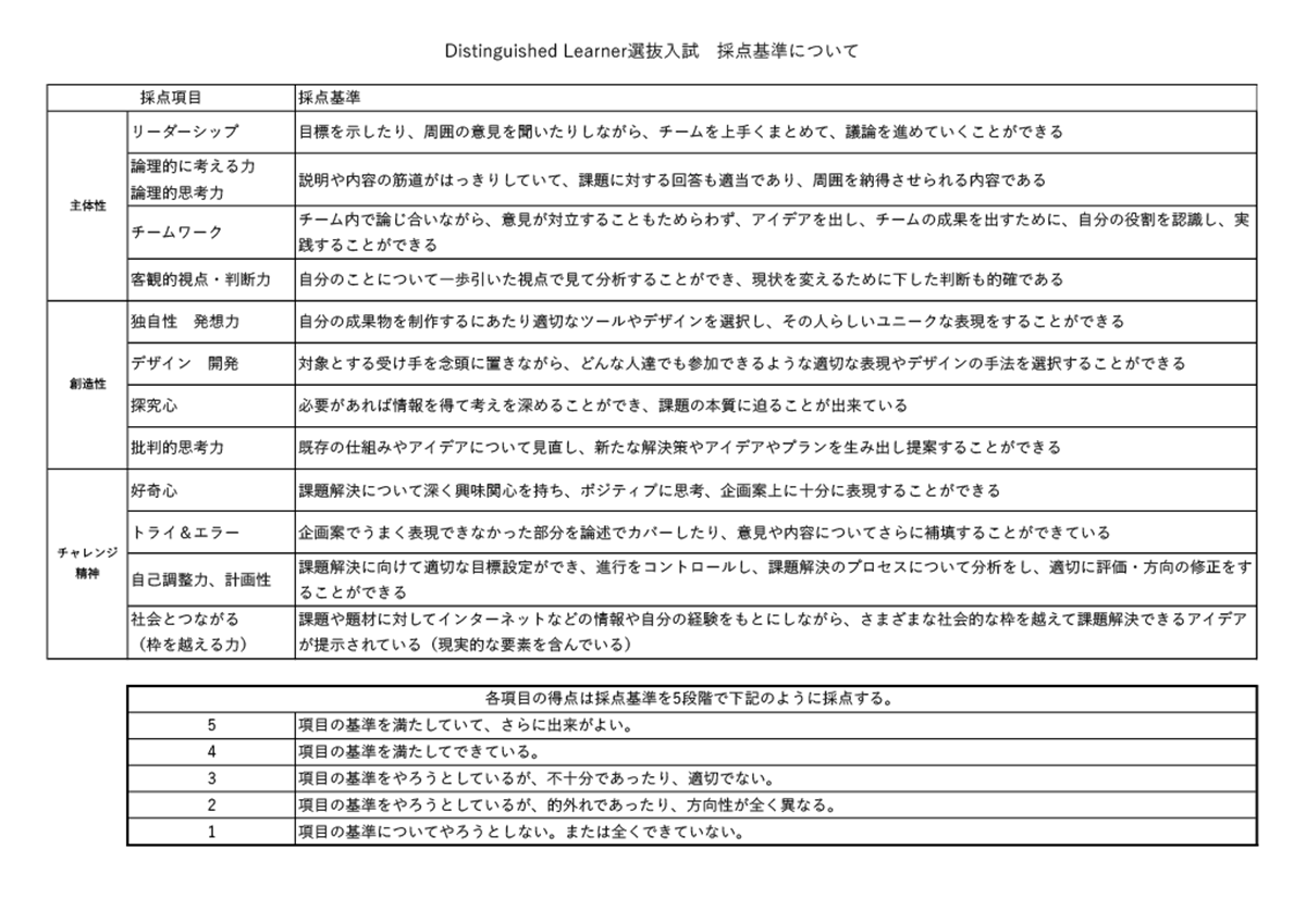 評価観点は、東京成徳学園の教育ビジョンである【「成徳」の精神を持つグローバル人材の育成】をもとに設けられています。判断基準が明確に示されているため、合否判定の透明性が高い点もこの入試の大きな特徴です。採点官は入試の一部始終を観察し、事前に公開されているルーブリック評価に基づいて5段階で評価を行います。